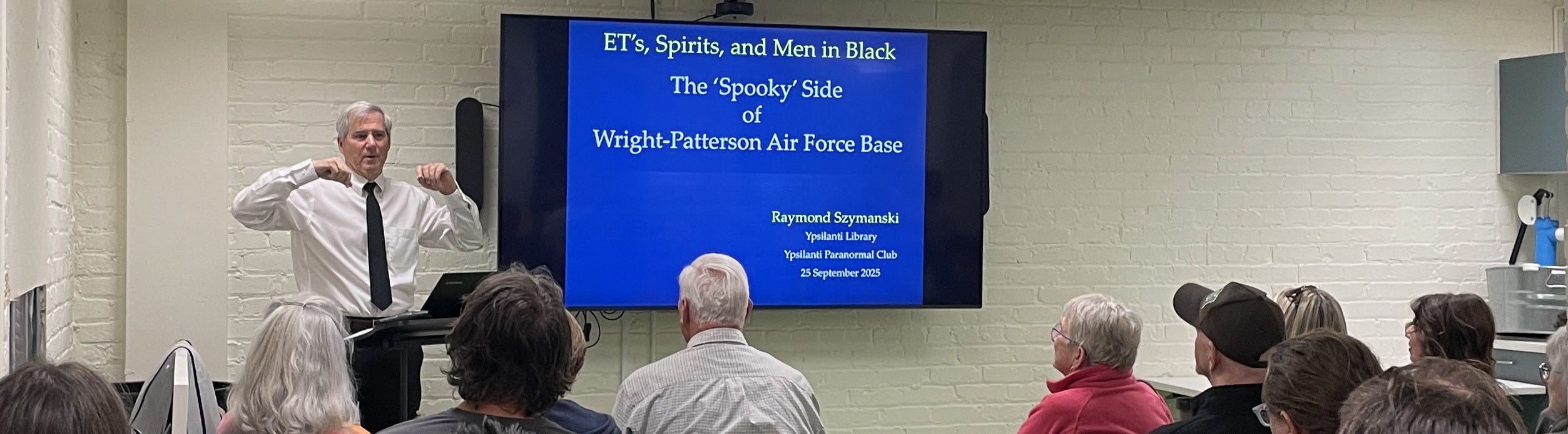 If we’ve learned anything from years of attending UFO talks, it’s this: never skip the Q&A. That’s when the audience shows its true colors—and where the weird gets wonderfully personal. This held true for Raymond Szymanski’s September 25th talk at the Ypsilanti, Michigan District Library.