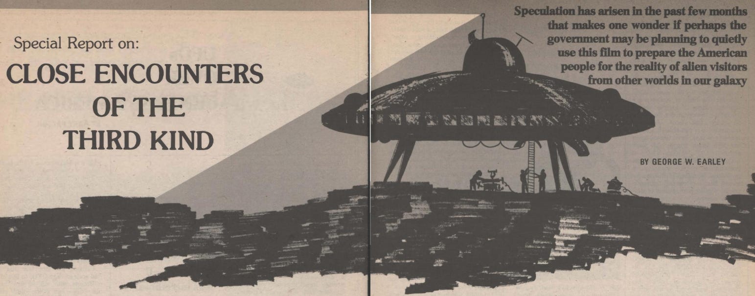 Researcher George Earley expressed similar alarm, wondering if we were on the brink of “a saucer sighting flap of unprecedented proportions which will be brought on by many overly imaginative film fans.”2 Witnesses influenced by the aliens and craft seen in CE3K would make the truth harder to detect. Earley also hit on a theme that would follow Spielberg’s UFO flicks for decades—the suggestion that they’re part of a carefully managed psychological operation disclosing the existence of extraterrestrials. As Earley speculated at the time: “Perhaps the government may be planning to quietly use this film to prepare the American people for the reality of alien visitors from other worlds in our galaxy.”
