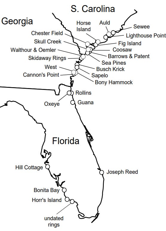 In my email exchange with the gracious academic, he presented convincing evidence for their ceremonial and religious significance: “‘Natural’ features on the landscape appear to have inspired ritual practices because of perceived connections between the Upper World and This World and arguably they were portals to travel between worlds, much of it related to world renewal. Shell rings, mounds, etc. may have been instruments of ritual intervention.”2