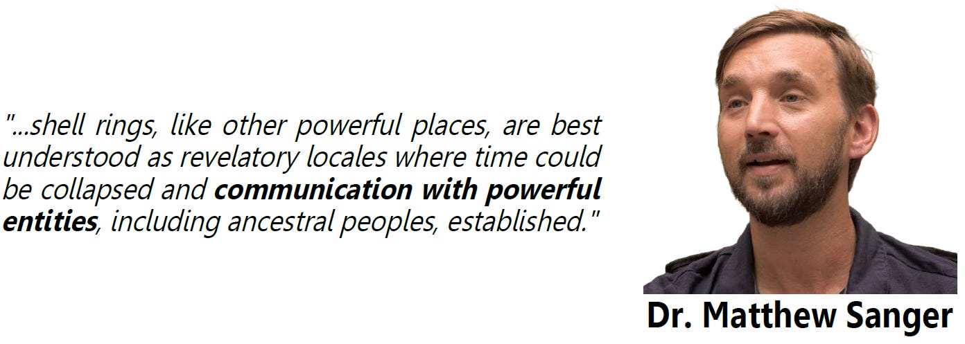 Dr. Sassaman gets no argument from us. His work supports the premise that ceremonial practices were associated with the creation of ritual infrastructure like shell rings. This idea gets a boost from the work of another highly respected name in the Archaic shellwork game, Matthew Sanger, PhD. Dr. Sanger is the curator of North American archaeology at the Smithsonian Institution’s National Museum of the American Indian, and an authority on how people lived during the Archaic period. Like Dr. Sassaman, he has hands-on experience excavating shell formations across the Southeast—including the one at Sea Pines. Sanger describes them as “revelatory locales;” spots on the landscape where ritual behavior “established communication with non-human forces.”3